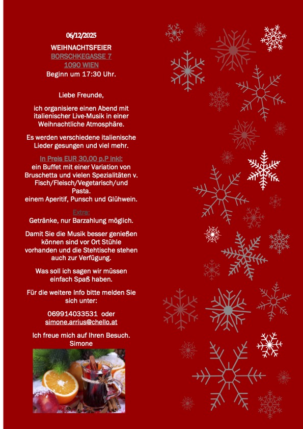 PROGRAMM ___________________________ 2025 _____________________________ AB 1. NOVEMBER 7. NOVEMBER 6. DEZEMBER SERATA ITALIANA AL GL STUDIO 1090 WIEN - Borschkegasse 7 (Eingang 15 Meter Liks vom Haustor)